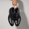Super cool lace-up shoe, with striking contemporary sophistication. The exemplary outline is given a cutting-edge curve with squared clasps and noticeable sewing on the toe. A thick adaptable layer of leather is sandwiched between the insole and sole, to make a cushion.